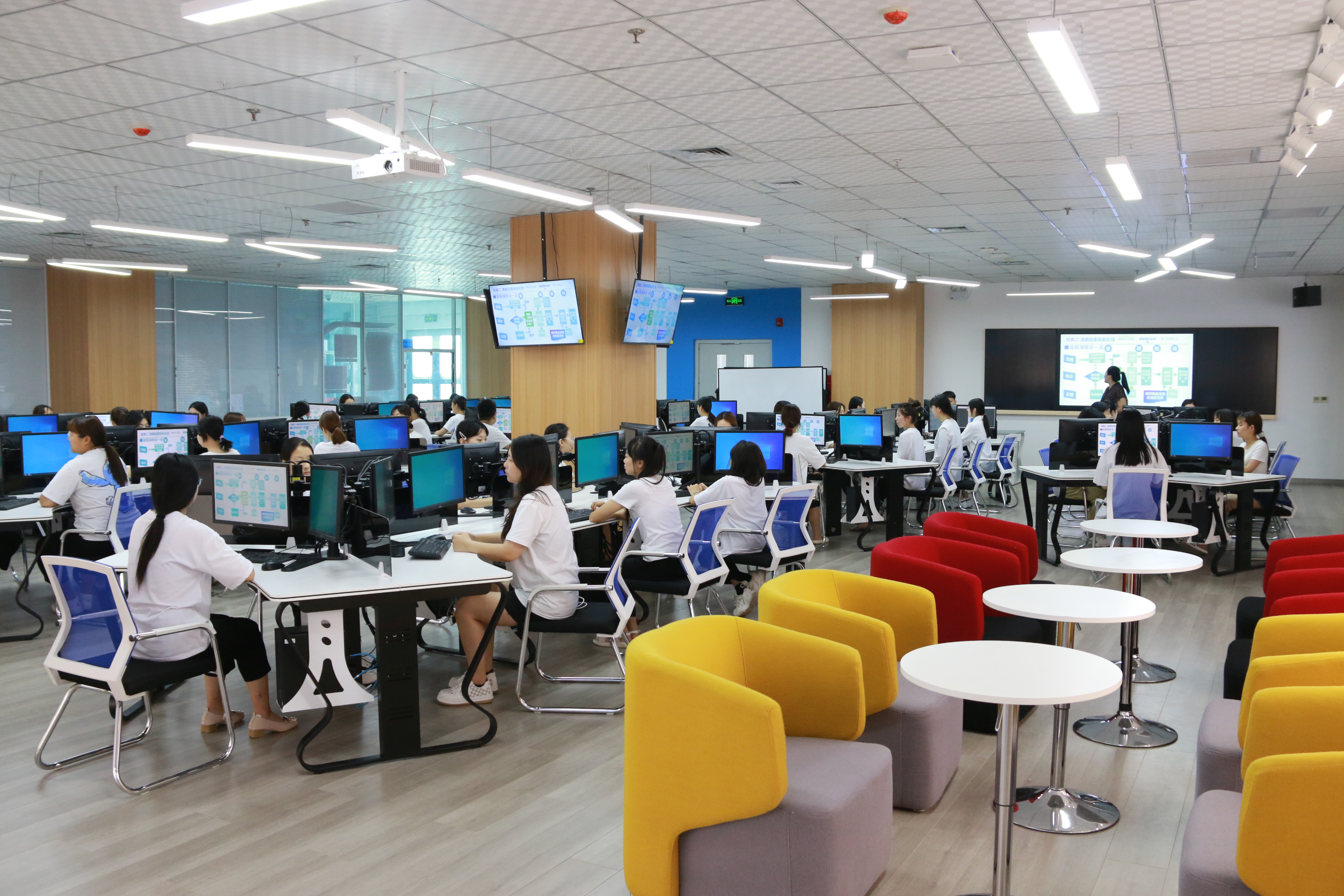 财经系会计数智化实训中心,建筑面积1015平米,仪器设备总值1000多万元。中心由6个虚拟仿真实训室、2个会计师工作室,1个纳税筹划研究所和1个会计课程资源开发工作室组成,已形成满足模拟实训、教改科研、代账服务、项目服务、培训鉴证、创业孵化等功能需求的“六位一体”生产性实践教学基地。