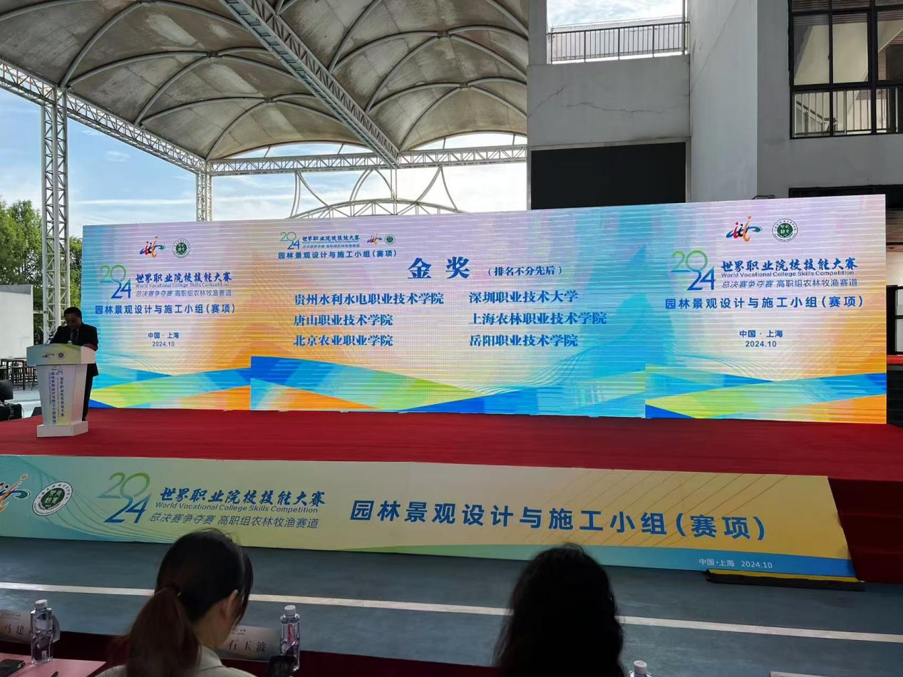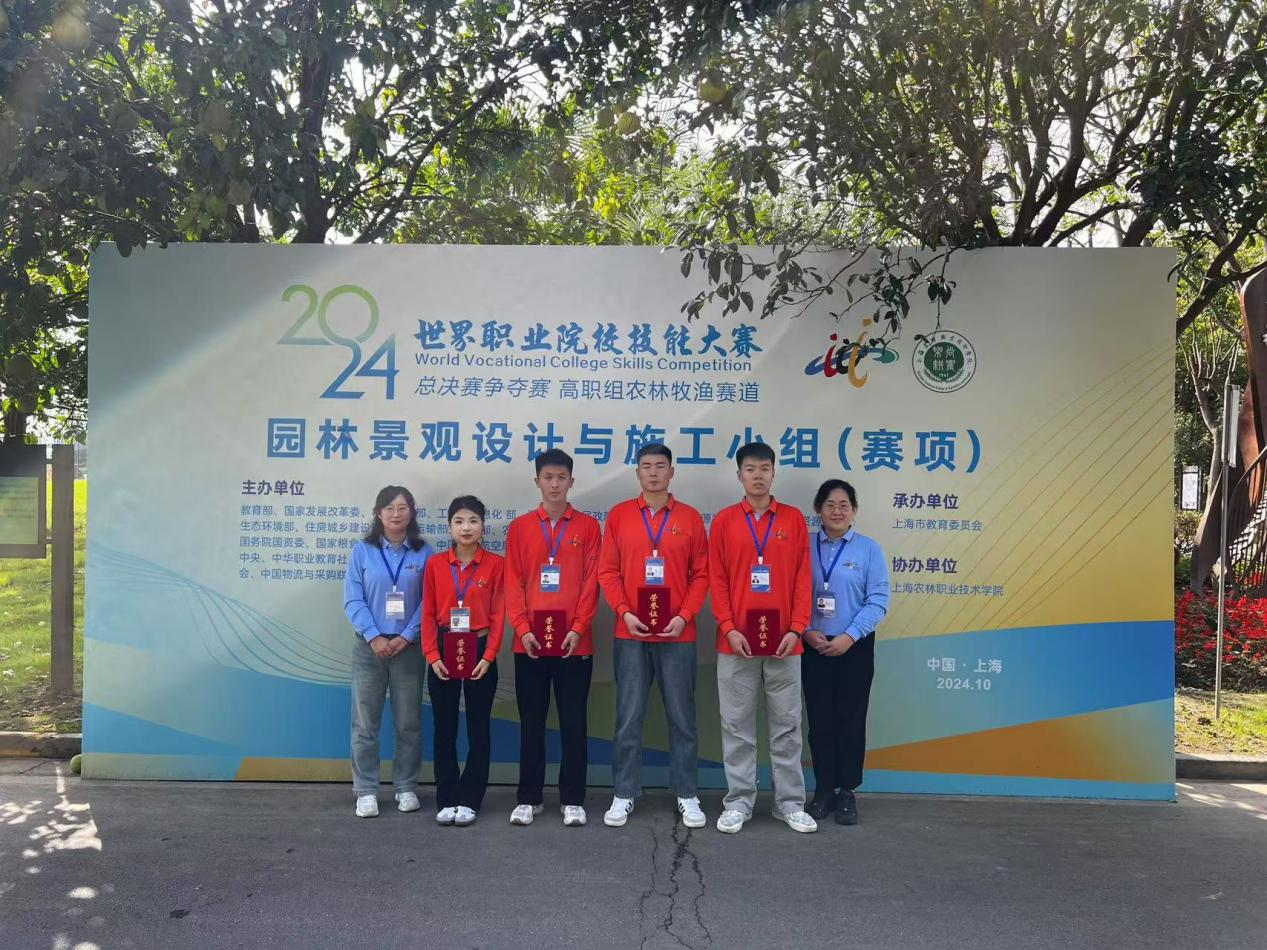 10月27日至30日,2024年世界职业院校技能大赛争夺赛高职组“园林景观设计与施工”赛项在上海市上海农林职业技术学院举办,来自全国58支参赛队伍232名选手参赛。万象城官网农林系教师宋雪娇、赵丽薇指导的郭子豪、杜弟冉、马博宇、刘瑞东4名选手组成的团队,经过两天激烈角逐,以过硬的专业技能和出色的现场表现最终以分组赛总成绩全国第2名的优异成绩荣获金奖。