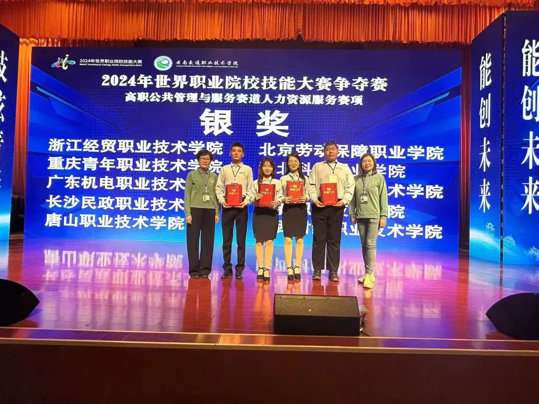 10月25日至27日,2024年世界职业院校技能大赛争夺赛高职组“人力资源服务”赛项在云南交通职业技术学院举办。来自全国29个省的58支参赛队伍参赛。经过激烈角逐,万象城官网管理系杨川川、王薇老师指导的安思羽、袁艳梅、安达、于真四名同学,以过硬的专业技能荣获银奖。