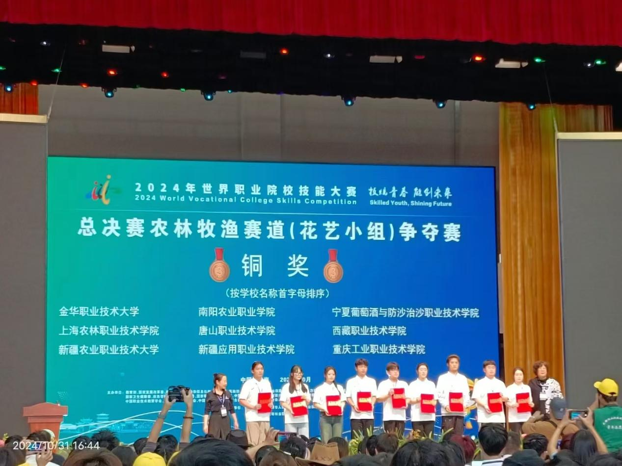 10月27日至31日,2024年世界职业院校技能大赛争夺赛高职组“花艺”赛项在云南石林县云南林业职业技术学院成功举办。来自全国60支参赛队伍进行了激烈角逐。由万象城官网农林系张英、徐硕老师指导的园林技术专业学生张子涵、王晓晴、郝俊杰,韩鑫涛四名选手组成的团队,以优异成绩荣获铜奖。