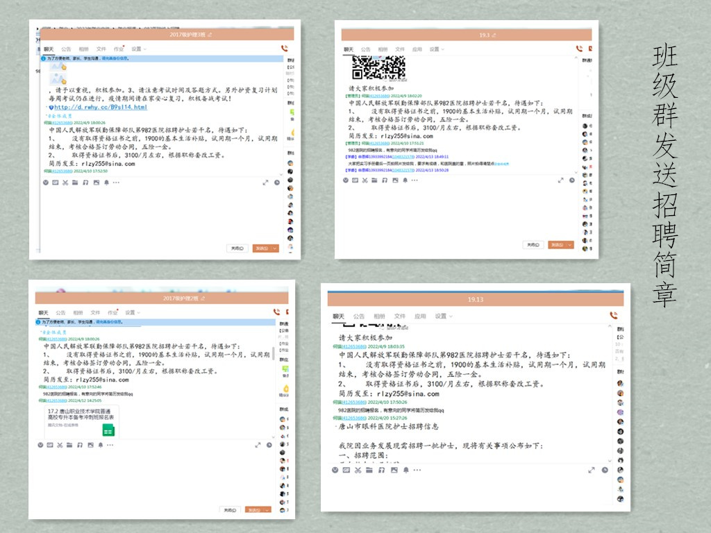 4月20日,中国人民解放军联勤保障部队第982医院针对护理系2022届毕业生发布了招聘启事,招聘护士若干名。针对此次招聘,护理系通过微信群、QQ群等多种方式进行宣传,鼓励学生积极报名,拓宽个人的就业渠道。经过宣传和组织,共有53名毕业生参与报名并投递简历。疫情结束后,将采用线上或线下的方式进行面试,敲定最终的人选。