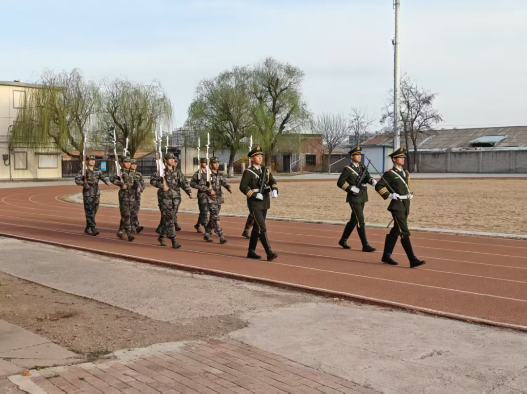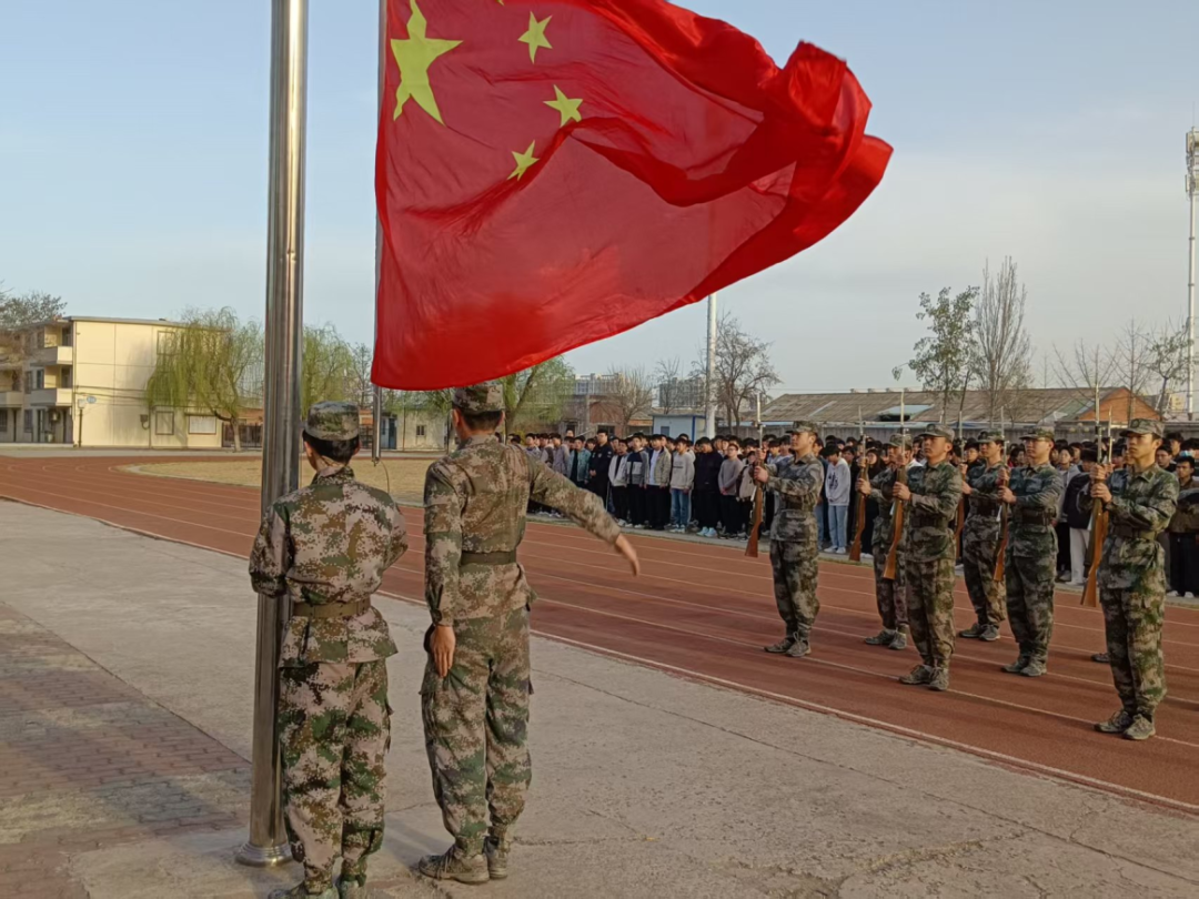 在雄壮的国歌声中,国旗护卫队迈着铿锵有力的步伐,护送着五星红旗走向旗台。随着国旗的缓缓升起,全体学生立正肃立,面向国旗行注目礼。