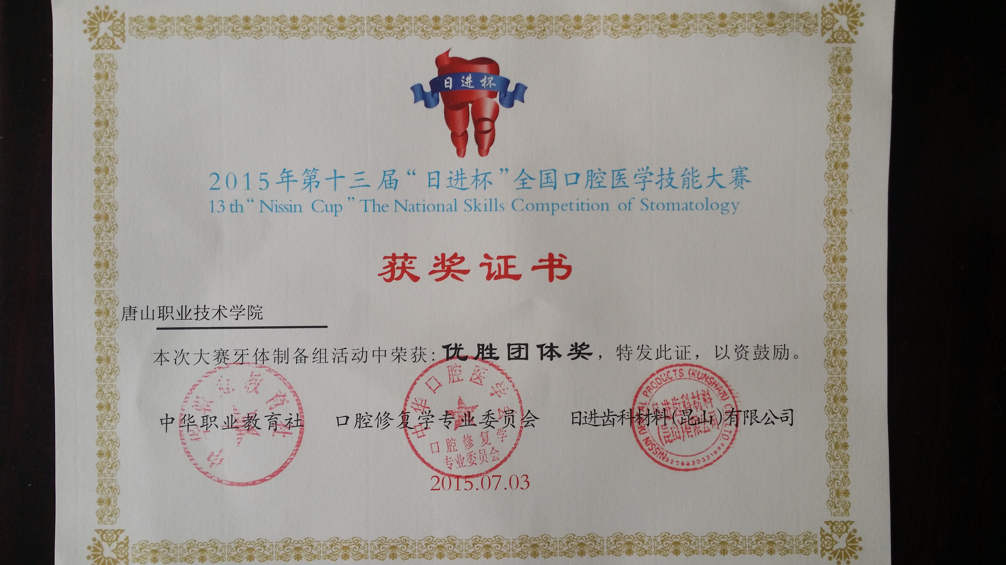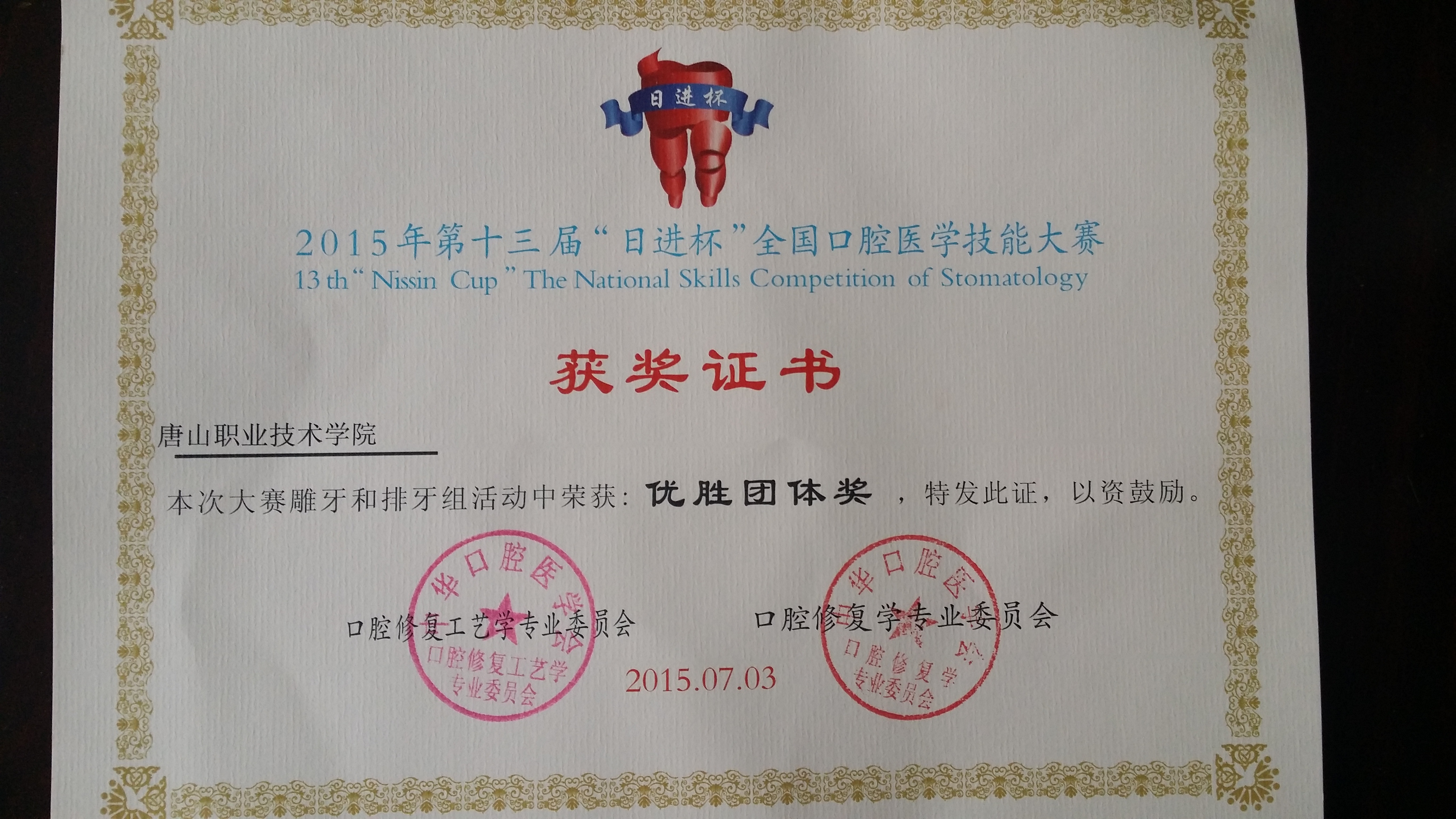 本次比赛的赛制与以往不同,参赛选手不仅要同时参加本组中的两项技能比赛,而且还要参加本组比赛相应的理论知识考试,参赛同学在赛制新、内容多、时间紧的情况下,取得了优异的成绩。其中刘明慧、高雪梅获得雕、排牙组三等奖;苗凤丽、王慧楠同学获得CAD/CAM设计三等奖; 李远、崔宇航同学分别获得牙体预备组三等奖和优秀奖;蒋菁、郭蕊欣、赵志华、曹颖楠、王辉老师获得“优秀指导教师奖”;万象城官网再次荣获了雕牙和排牙组、牙体制备组优胜团体奖。