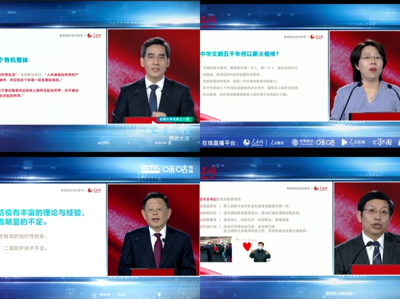 本次“思政大课”特别邀请艾四林、秦宣、王炳林、冯秀军4位教授,结合“马克思主义基本原理概论”、“毛泽东思想和中国特色社会主义理论体系概论”、“中国近现代史纲要”、“思想道德修养与法律基础”4门必修课教学内容,解读党中央关于疫情防控的决策部署,分析中国抗疫彰显的中国共产党领导和中国特色社会主义制度的显著优势,讲述防疫抗疫一线的感人故事。