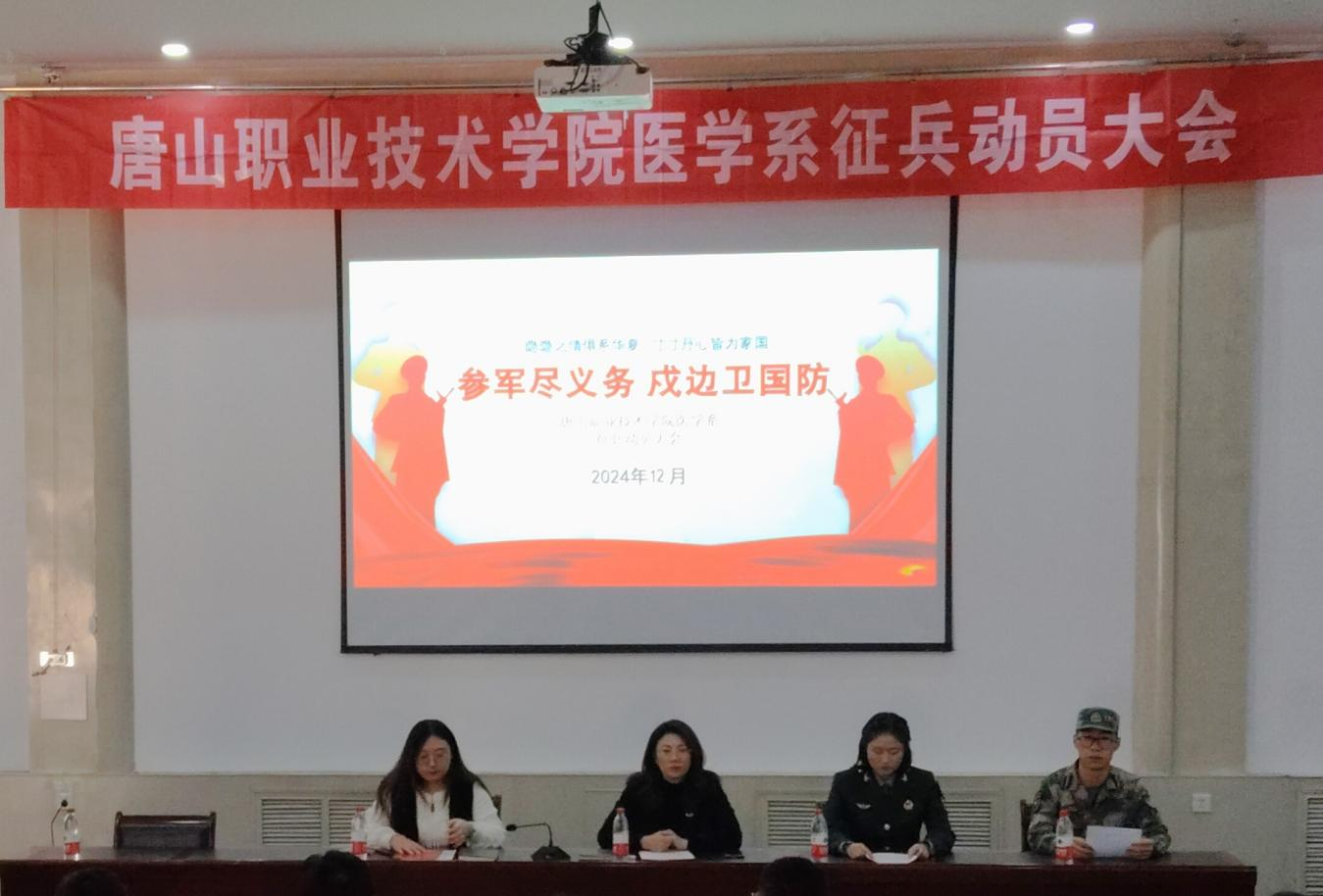 为积极响应国家大学生征兵入伍的号召,切实做好我系大学生征兵宣传工作。2024年12月3日,医学系组织召开了征兵动员大会。系党总支副书记蒋丽洪老师、辅导员耿婧轩老师出席动员会,退伍学生代表和2023级意向参军同学参加了会议。本次动员会采取现场宣讲的方式,在多媒体学术报告厅设立会场。